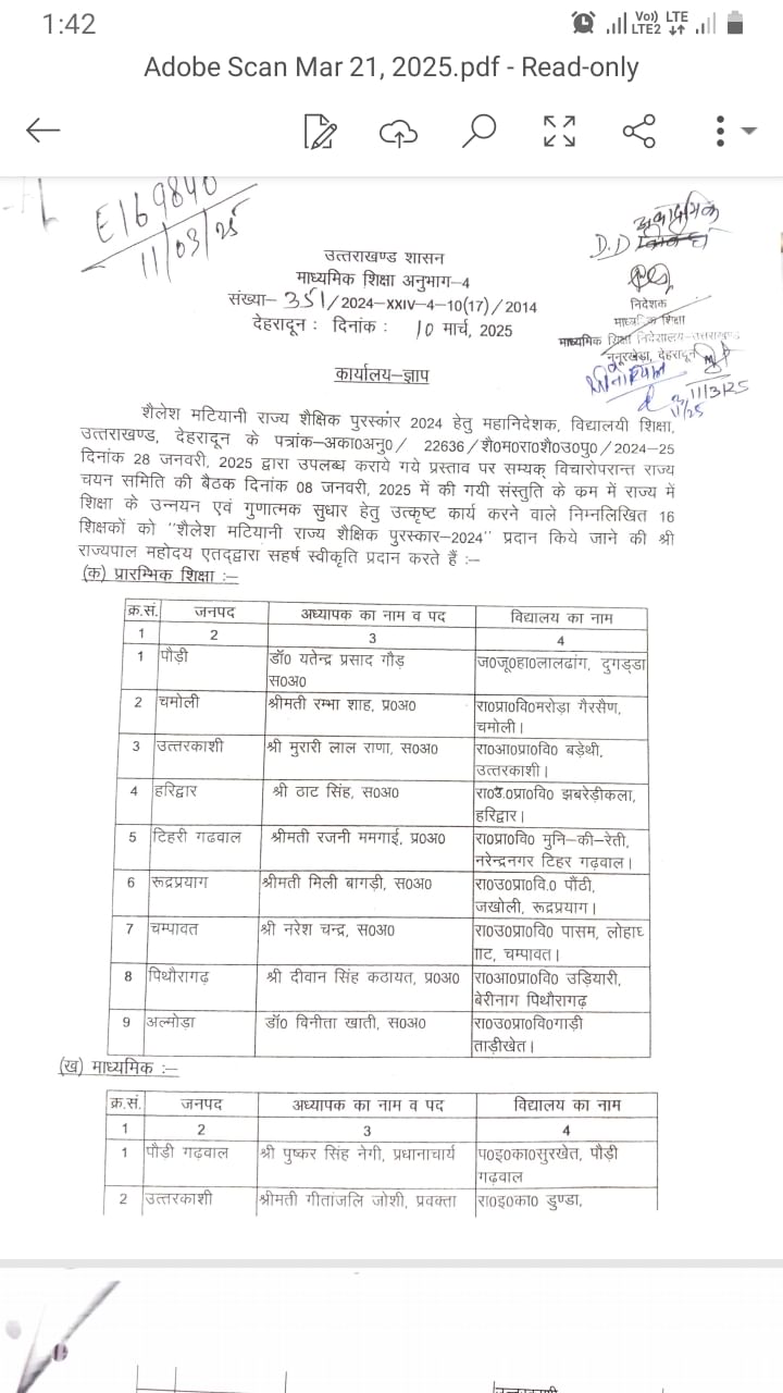 राज्य में शिक्षा के उन्नयन एवं गुणात्मक सुधार के लिए उत्कृष्ट कार्य करने 16 शिक्षकों को शैलेश मटियानी राज्य शैक्षिक पुरस्कार-2024 प्रदान किया जाएगा। इस संबंध में सचिव रविनाथ रमन ने आदेश जारी किया है।