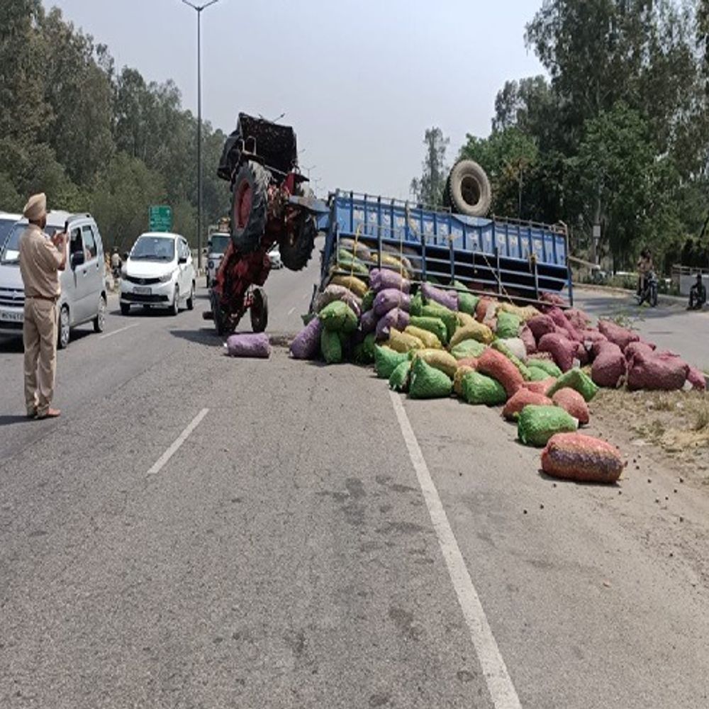 लुधियाना| दिल्ली-अमृतसर हाईवे रोड पर स्थित जालंधर बाईपास चौक के पास नवदीप रिसोर्ट्स के बाहर एक आलुओं से लदी ओवरलोड ट्रैक्टर ट्रॉली बेकाबू होकर पलट गई। यह हादसा उस वक्त हुआ भास्कर न्यूज |लुधियाना चौकी और ट्रैफिक पुलिस मौके पर पहुंचे और घटना की जांच की