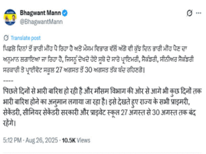 Punjab Desk: पंजाब में लगातार हो रही भारी बारिश ने हालात बिगाड़ दिए हैं। कई जिलों में पानी भरने से जनजीवन प्रभावित हो गया है। स्थिति को देखते हुए मुख्यमंत्री भगवंत मान ने राज्य के सभी स्कूलों को बंद करने का ऐलान किया है। उन्होंने मंगलवार को सोशल मीडिया प्लेटफॉर्म X (पूर्व ट्विटर) पर जानकारी साझा करते हुए बताया कि पंजाब के सभी सरकारी और निजी प्राइमरी, सेकेंडरी व सीनियर सेकेंडरी स्कूल 27 से 30 अगस्त 2025 तक बंद रहेंगे।