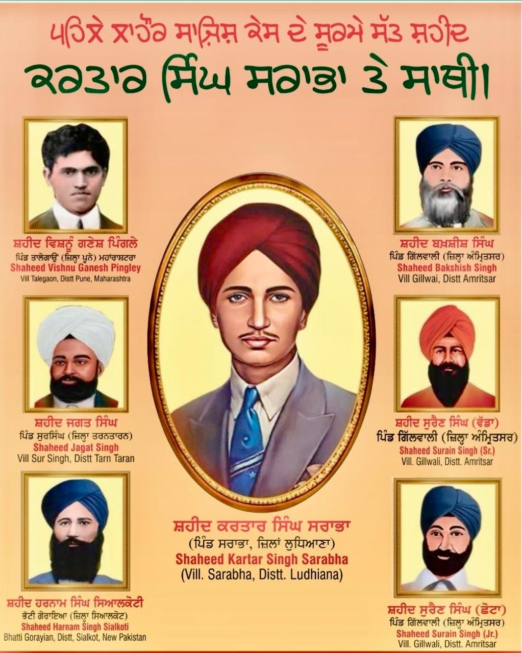 Prof. Gill has said that seven heroes were hanged together for the first time in the freedom struggle on 16 November 1915. Out of the seven martyrs who were martyred along with Shaheed Kartar Singh Sarabha, six were Punjabis whose names were Shaheed Bhai Jagat Singh of village Sur Singh (Tarn Taran), Shaheed Bhai Bakshish Singh, Shaheed Bhai Surayan Singh (Big), Shaheed Bhai Surayan Singh (Small). The last three martyrs are from village Gillwali (Amritsar). Shaheed Harnam Singh was from Sialkoti (Village Bhatti Goraya) Sialkot) while the seventh martyr Vishnu Ganesh Pingle was from Talegaon (Pune) Maharashtra.