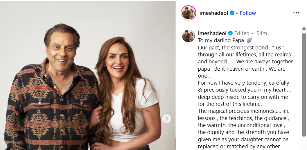धर्मेंद्र की 90वीं जन्मतिथि पर बेटी एशा भावुक, साझा की यादें और तस्वीरें