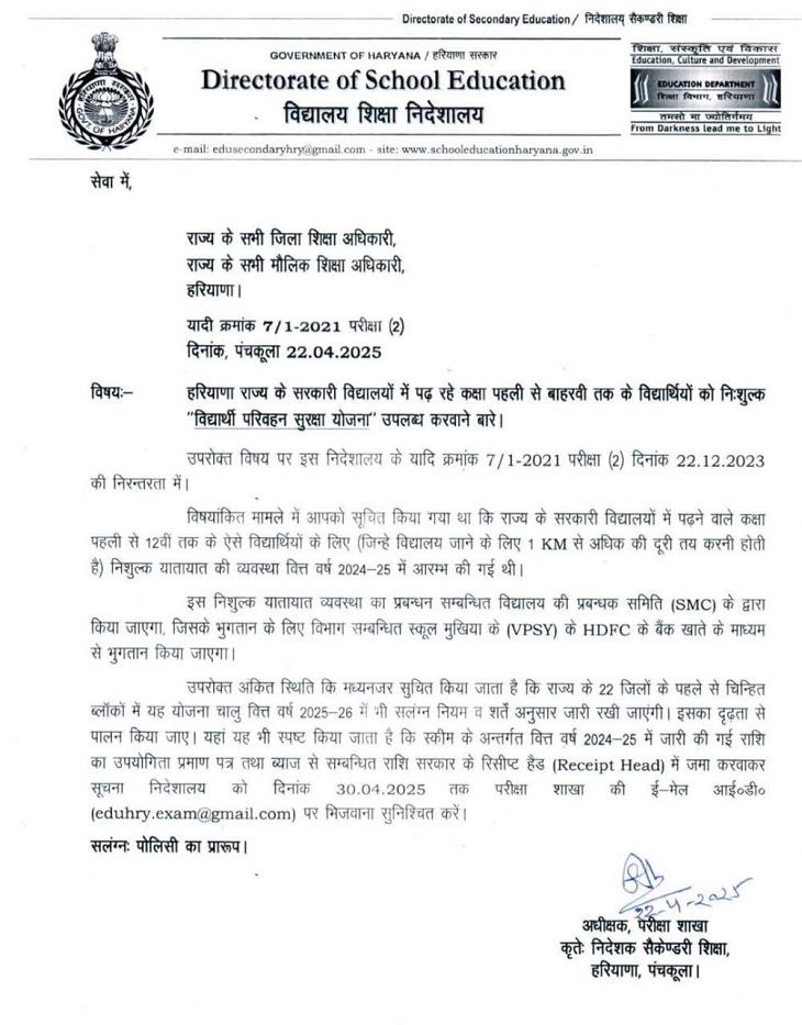 हरियाणा के स्कूलों में पहली से 12वीं के स्टूडेंट्स के लिए फ्री बस सेवा इस साल भी जारी रहेगी। इसको लेकर शिक्षा विभाग की ओर से सभी जिलों के जिला शिक्षा अधिकारियों को लेटर जारी किया गया है। इस योजना के तहत उन छात्र छात्राओं को लाभ मिलेगा जिनका स्कूल उनक