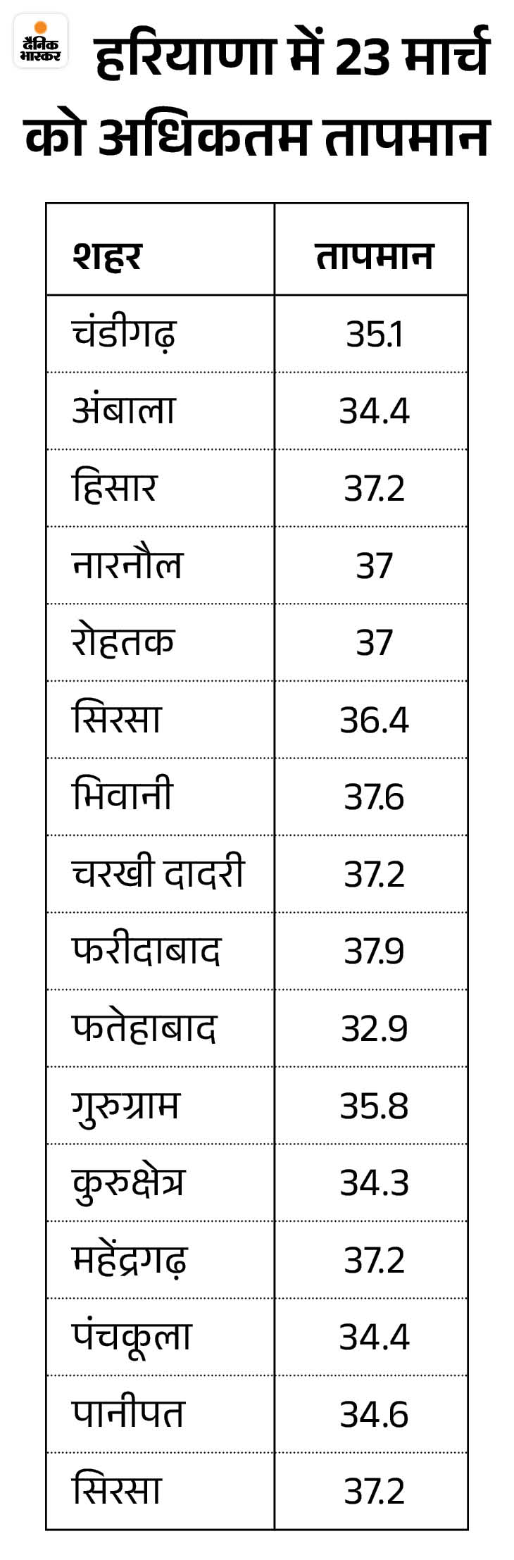 हरियाणा में पिछले कई दिनों से तापमान लगातार बढ़ता जा रहा है। 27 मार्च को प्रदेश में अधिकतम तापमान 37.9 डिग्री सेल्सियस पहुंच गया। फरीदाबाद जिले का बोपोनी एरिया सबसे गर्म रहा।