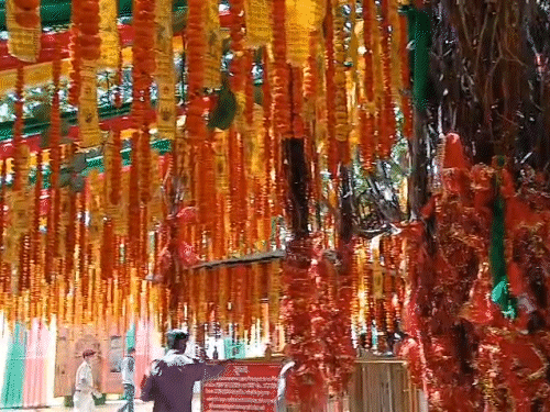 चिंतपूर्णी मंदिर में फूलों से लिखा गया जय माता दी।