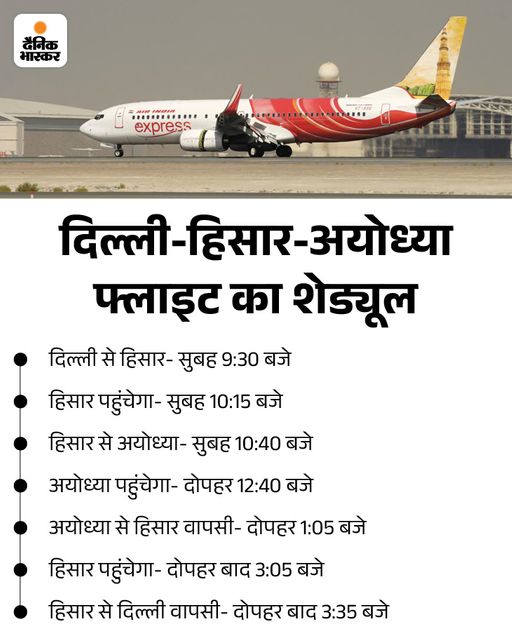विमान सुबह 10:40 बजे अयोध्या के लिए उड़ान भरेगा। 12:40 पर विमान अयोध्या पहुंच जाएगा। हर शुक्रवार और रविवार को फ्लाइट जाएंगी। अयोध्या के लिए जाने वाला विमान सुबह दिल्ली से हिसार आएगा। इसके अलावा जम्मू, जयपुर और अहमदाबाद के लिए भी उड़ानें शुरू की जाएंगी।
