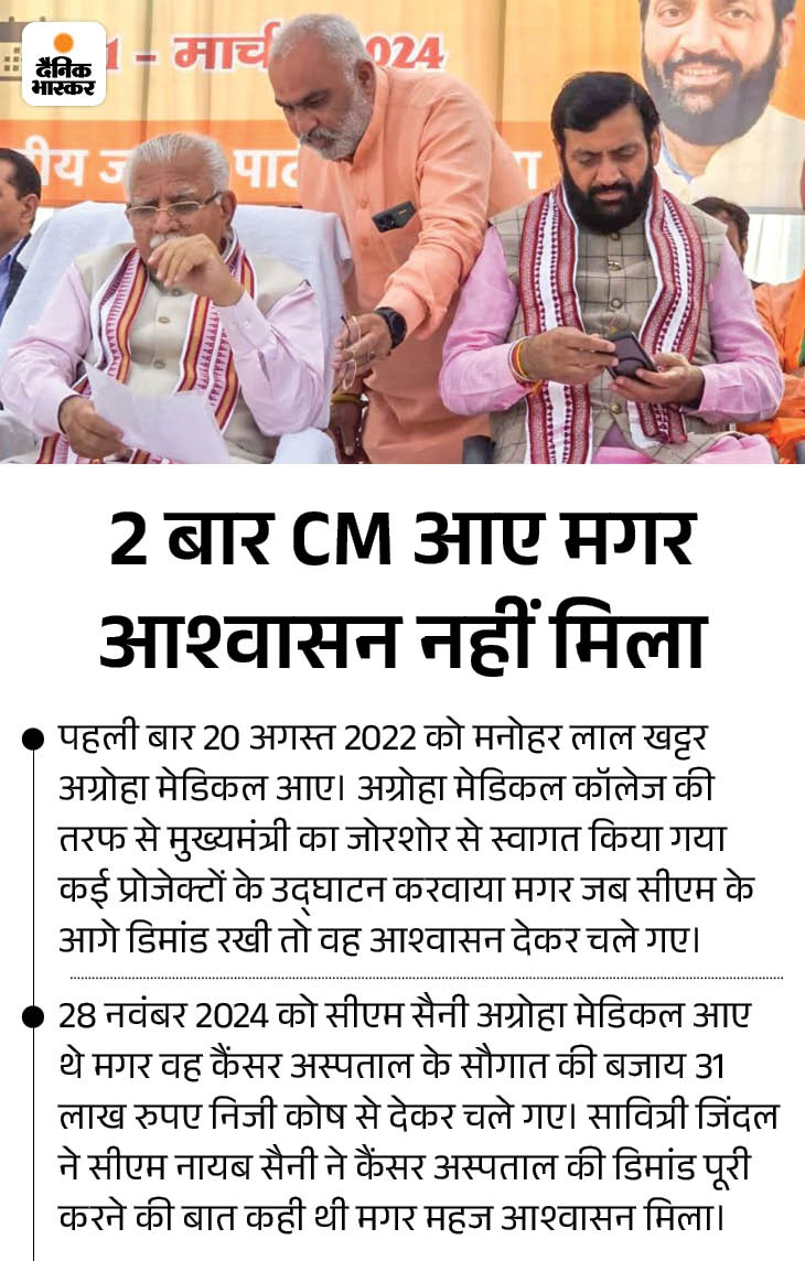 मेडिकल कॉलेज प्रशासन ने 3 साल पहले कैंसर अस्पताल की मंजूरी के लिए आवेदन किया था। 6 मार्च 2022 को इसकी आधारशिला भी रखी जा चुकी है, लेकिन अभी तक सरकार से मंजूरी नहीं मिली है। कैंसर अस्पताल पर करीब 120 करोड़ रुपए की लागत आ सकती है, जिसमें से 60 करोड़ रुपए मुंबई के दानी अग्रवाल ने देने की सहमति दी थी मगर, हरियाणा सरकार ने इसकी भी मंजूरी नहीं दी।