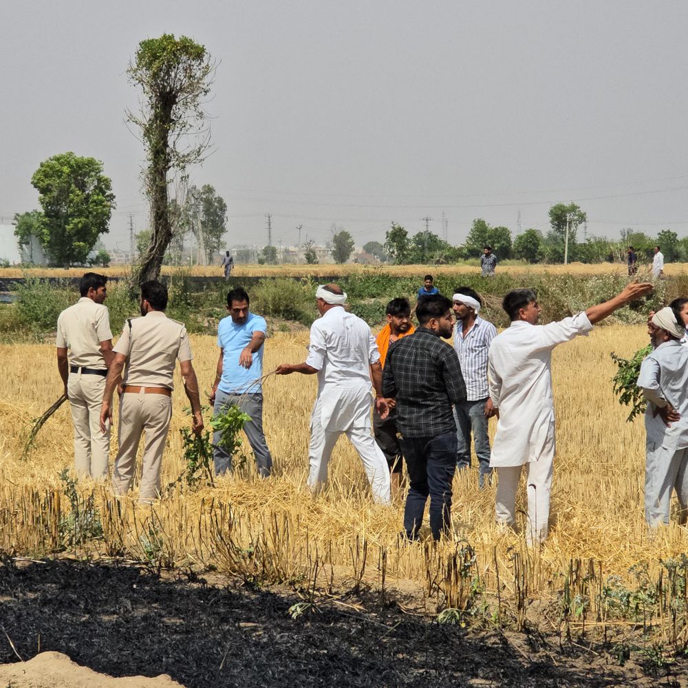 नरवाना में गेहूं के फोनों में लगी आग को बुझाते किसान व मौजूद पुलिस।