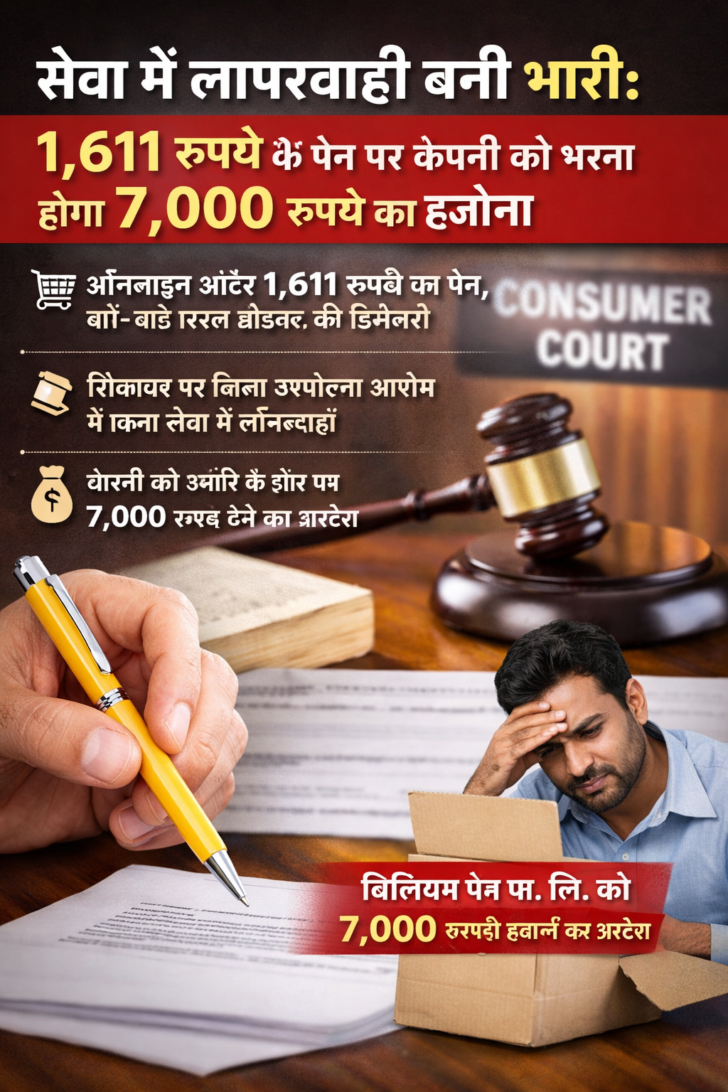 Chandigarh Desk: सेवा में की गई छोटी-सी लापरवाही भी कंपनी को महंगी पड़ सकती है—यह बात जिला उपभोक्ता आयोग के एक अहम फैसले से साफ हो गई है। आयोग ने 1,611 रुपये कीमत वाले पेन के मामले में बेंगलुरु स्थित विलियम पेन प्राइवेट लिमिटेड को सेवा में कमी का दोषी मानते हुए शिकायतकर्ता को 7,000 रुपये हर्जाना देने के निर्देश दिए हैं।