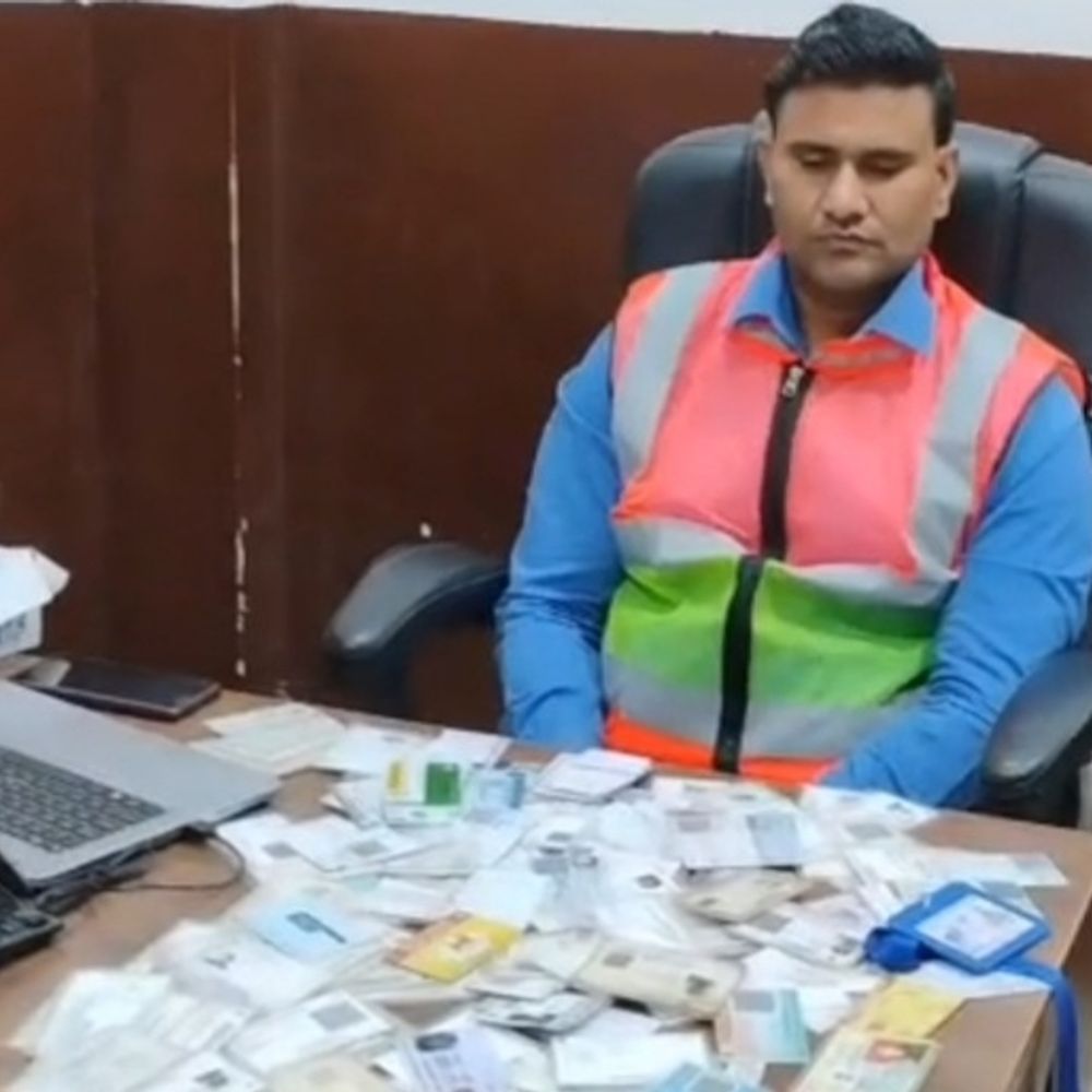 टोल प्लाजा का मैनेजर बरामद नकली आईडी दिखाते हुए।