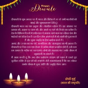 राष्ट्रपति द्रौपदी मुर्मू ने भी देश और विदेश में रह रहे सभी भारतीयों को दीवाली की शुभकामनाएं देते हुए कहा कि यह त्योहार अंधकार पर प्रकाश, अज्ञान पर ज्ञान और अधर्म पर धर्म की विजय का प्रतीक है। उन्होंने कहा कि दीवाली प्रेम, भाईचारे और खुशहाली का त्योहार है, जो लोगों को आपसी एकता और सद्भाव से जोड़ता है।