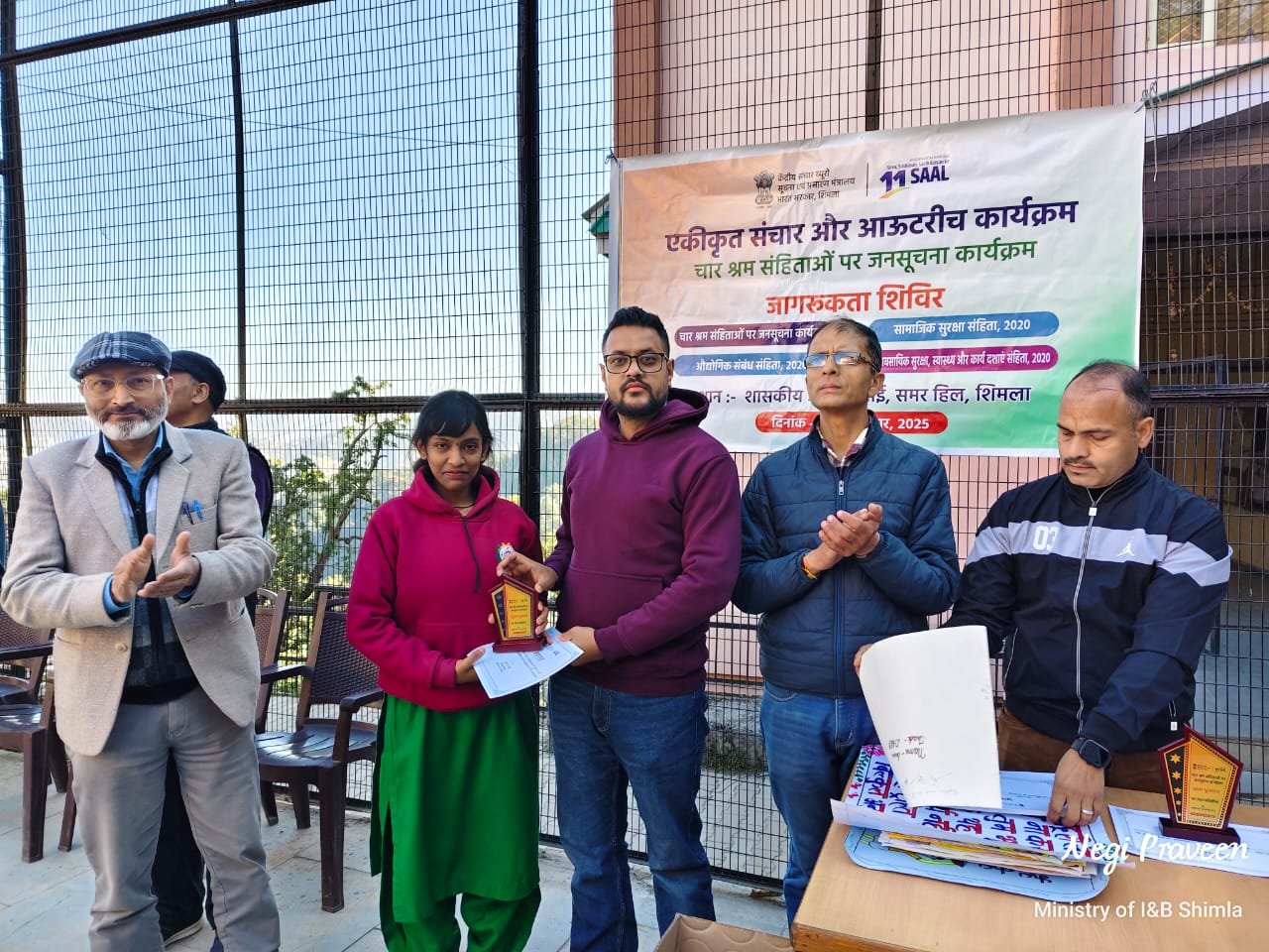 कार्यक्रम की अध्यक्षता केंद्रीय संचार ब्यूरो शिमला के सहायक निदेशक प्रकाश पंत ने की । नये श्रम संहिताओं पर जन सूचना अभियान के तहत दो दिवसीय कार्यक्रम में बड़ी संख्या में आई टी आई के प्रशिक्षणार्थियों, प्रशिक्षकों एवं अन्य स्टाफ ने हिस्सा लिया । इस दौरान शिमला स्थित विश्वविद्यालय विधि संस्थान की सहायक प्राध्यापक डॉक्टर संयोगिता ठाकुर ने छात्रों को इन श्रम कानूनों की बारीकियां समझाई।