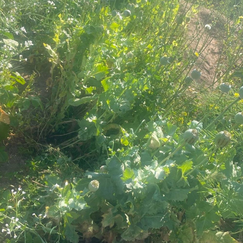 घर में लगी सब्जियों की बाड़ी में अफीम के हरे पौधों का दृश्य।