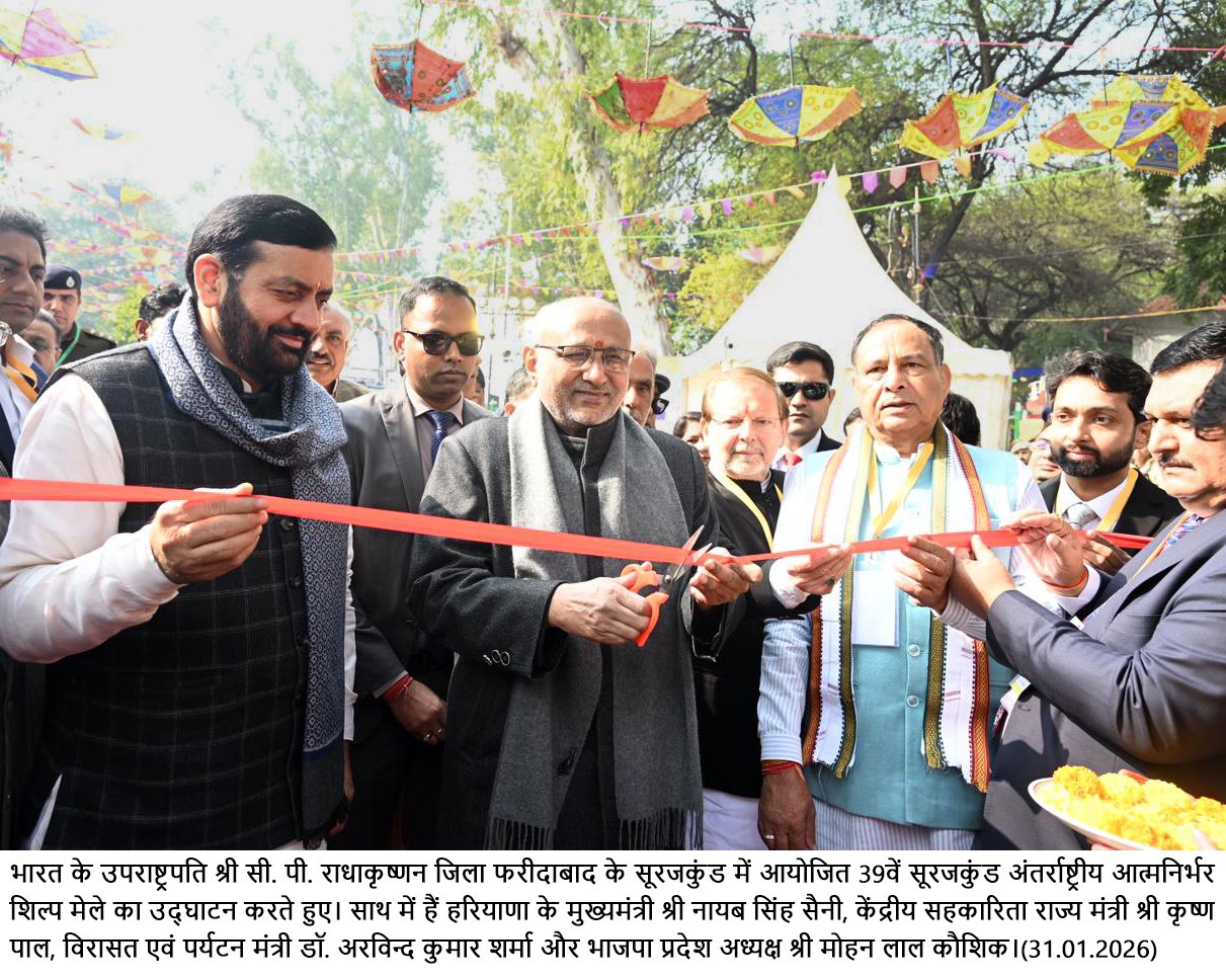 उपराष्ट्रपति सी.पी. राधाकृष्णन ने किया 39वें सूरजकुंड अंतर्राष्ट्रीय आत्मनिर्भर शिल्प मेले का उद्घाटन              ‘लोकल टू ग्लोबल’ और ‘आत्मनिर्भर भारत की पहचान’ को साकार करने का सशक्त मंच है सूरजकुंड शिल्प मेला – मुख्यमंत्री                                                                                                                         शिल्पकारों की कला से दिखी ‘अतुल्य भारत’ की झलक                                                                     लोकल को ग्लोबल बनाकर आत्मनिर्भर भारत को दें नई पहचान – मुख्यमंत्री