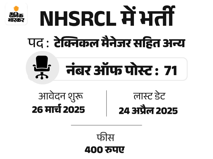 नेशनल हाई स्पीड रेल कॉर्पोरेशन लिमिटेड यानी NHSRCL में जूनियर टेक्निकल मैनेजर सहित अन्य के 71 पदों पर भर्ती निकली है। कैंडिडेट्स 24 अप्रैल तक इसके लिए अप्लाई कर सकते हैं। इसके लिए आधिकारिक वेबसाइट nhsrcl.in पर जाकर एप्लिकेशन फॉर्म भर सकते हैं।