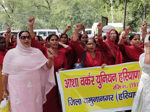 यमुनानगर में सचिवालय के बाहर प्रदर्शन कर ज्ञापन सौंपते हुए आशा वर्कर।